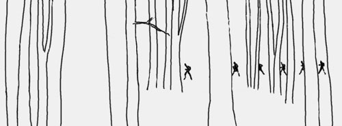 Der Titel verweist unverkennbar auf das bekannte Sprichwort, das ergötzliche Video selbst spielt mit dem, was man sieht oder nicht, was man zu sehen glaubt oder auch zu sehen müssen glaubt. Vor weissem Grund einem Wald von dünnen, schwarzen Strichen. Man ahnt, was gemeint ist. Doch was ist Baum, was Zwischenraum? Das angedeutete Baumlabyrinth erinnert an Magrittes "verlorenen Jockey".