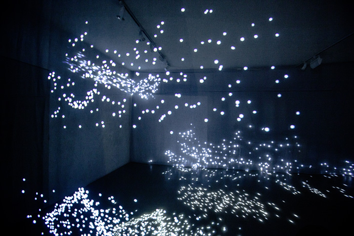 Die Arbeit „1000 Teilchen“ (2011) greift auf Himmelskörper zurück und auf die Idee ihrer Lesbarkeit und Deutung. Auf Stoffbahnen projizierte Sternformationen erinnern an Schriften und an die von uns oft als magisch bezeichneten, überirdische Botschaften.